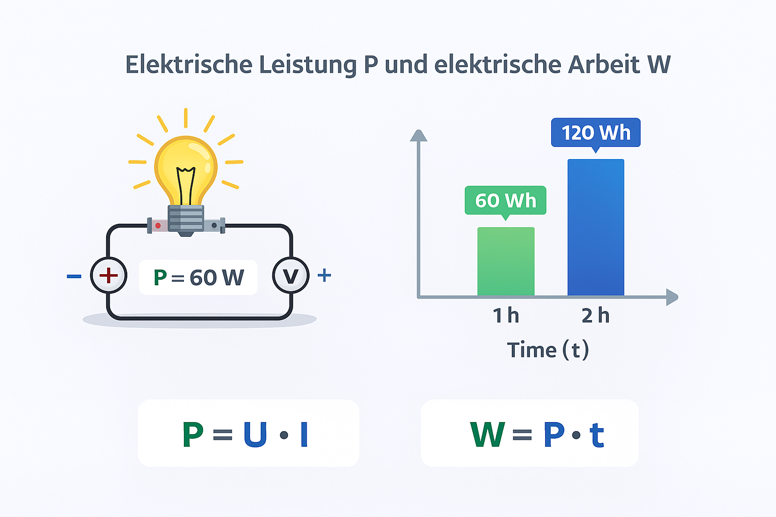 Die elektrische Leistung P beschreibt, wie schnell elektrische Energie umgesetzt wird. Sie zeigt, wie viel Energie pro Sekunde verbraucht oder in andere Formen (Wärme, Licht, Bewegung) umgewandelt wird.