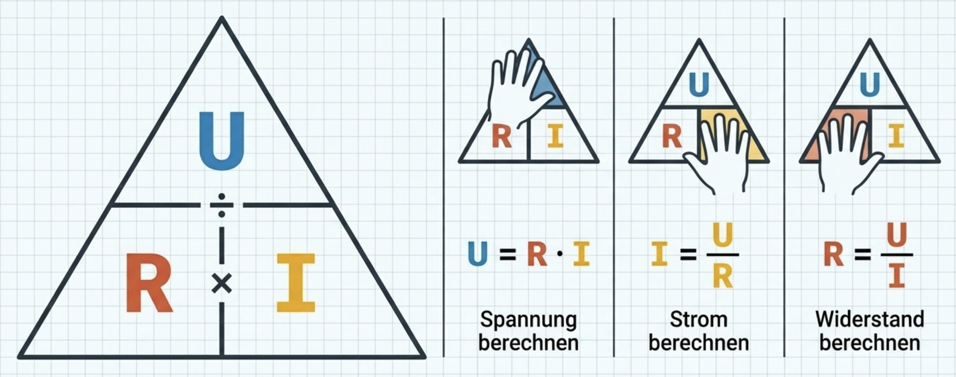 Die drei Grundformeln lauten: U = R · I, I = U / R und R = U / I. Voraussetzung ist immer, dass zwei Größen bekannt sind. Für das Rechnen müssen alle Größen in zueinander passenden Einheiten vorliegen. Praktisch sind besonders 1 A = 1000 mA, 1 kΩ = 1000 Ω und 1 V = 1000 mV.