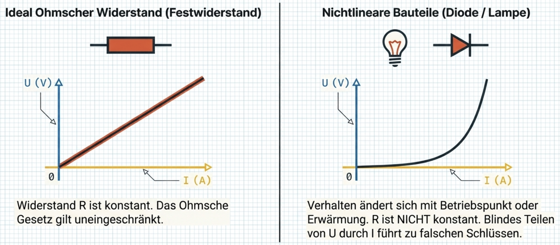 Ein idealer ohmscher Widerstand zeigt einen linearen Zusammenhang zwischen Spannung und Strom. Eine Lampe oder eine Diode dagegen nicht. Dort ändert sich das Verhalten mit Erwärmung oder Betriebspunkt. Wer blind nur U durch I teilt und einen festen Widerstand annimmt, kann zu falschen Schlüssen kommen.